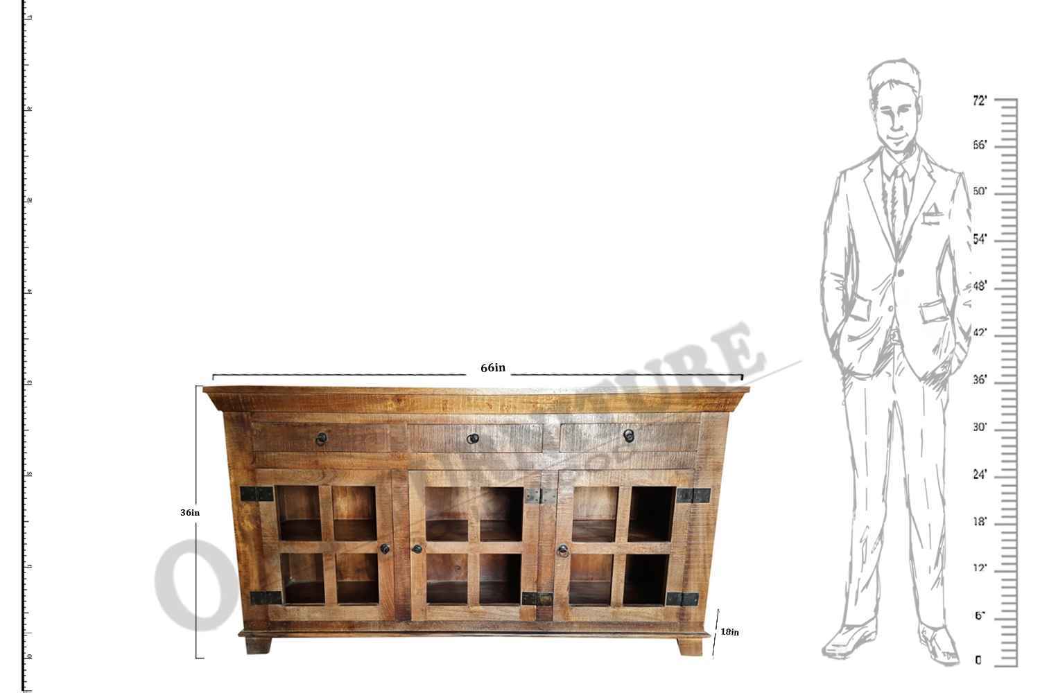 Sutter four drawer two door side board is made by Mango wood with rustic finish. This is four drawer and two door side board. Side board inner storage section divided in two parts by middle shelf. Side board gives antique old look that makes your interior more attractive. You can buy Solid wood furniture online from O my furniture.
