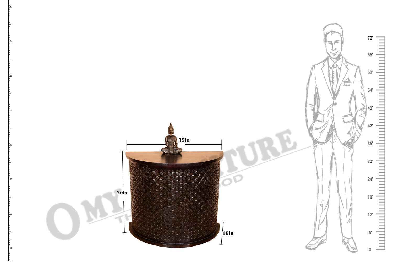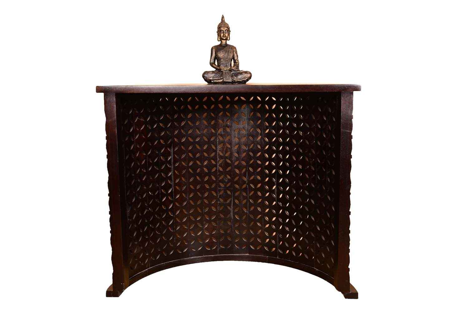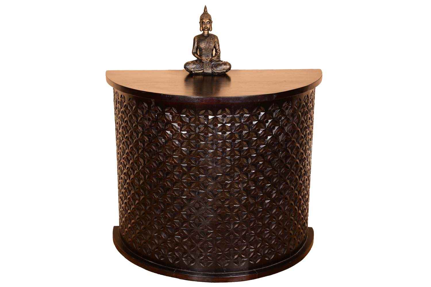 jamboree half shape Counter cum side table  item is made by Mango wood with walnut finish.It is half round rose carving console decor table.It’s inner portion is blank.It is a light weighted and easy to move.Design and walnut polish make this product more beautiful and will make your interior more attractive.You can buy Solid wood furniture online from O my furniture.