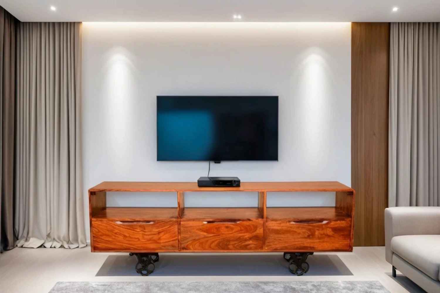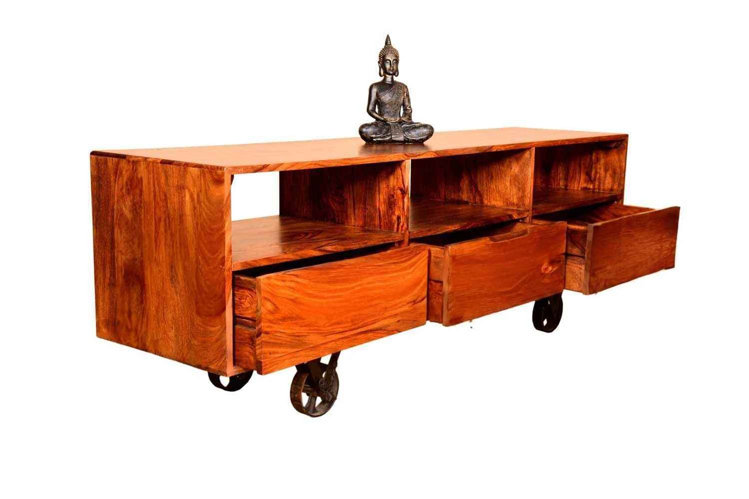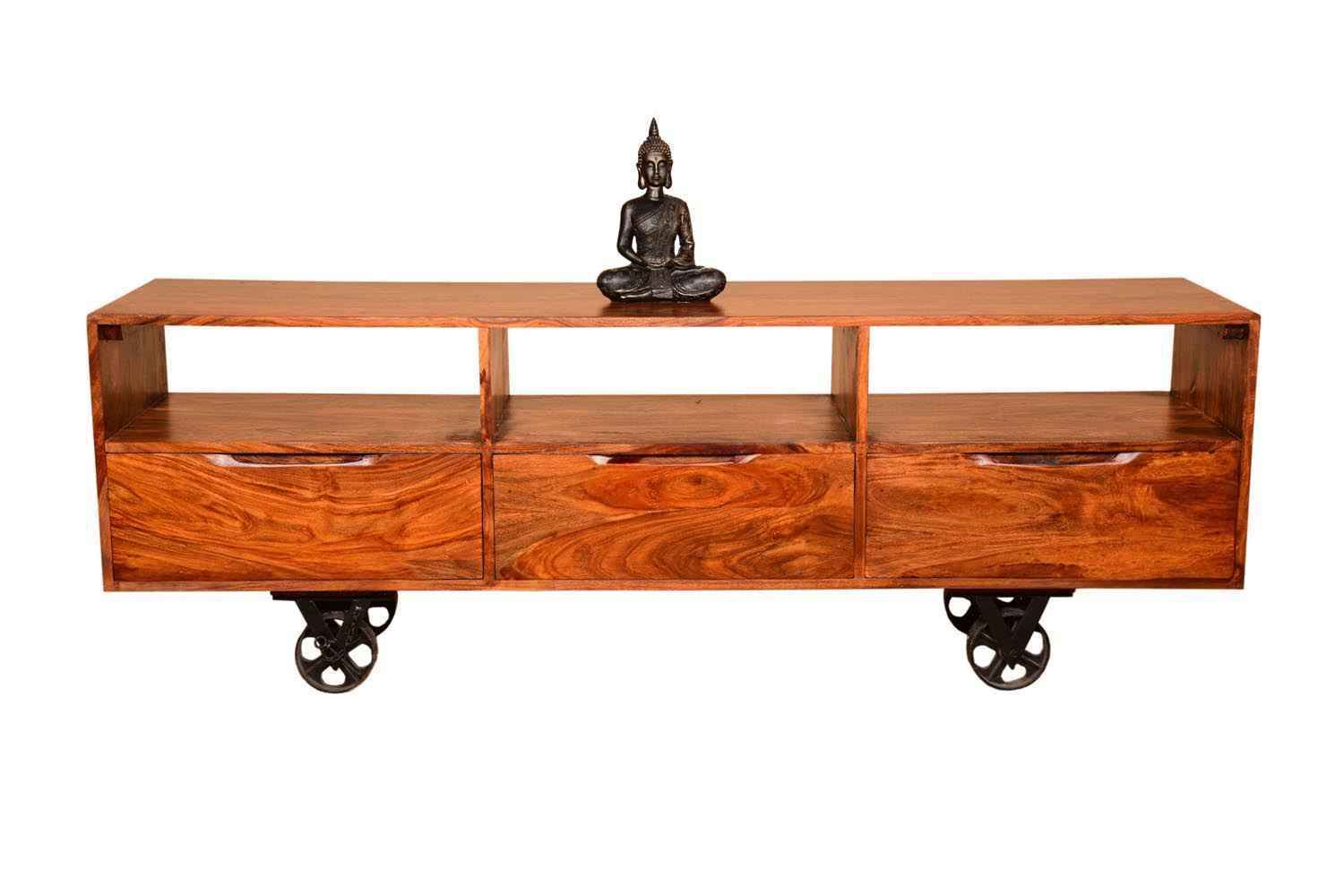 Recto three drawer tv unit is made by Sheesham (Rosewood) with teak finish. It is a television unit that contains three drawers and one blank section. We use Stainless steel accessories. It is a heavy and stable product. Sheesham wood furniture always count as a best quality product to buy.You can buy Solid wood furniture online from O my furniture.