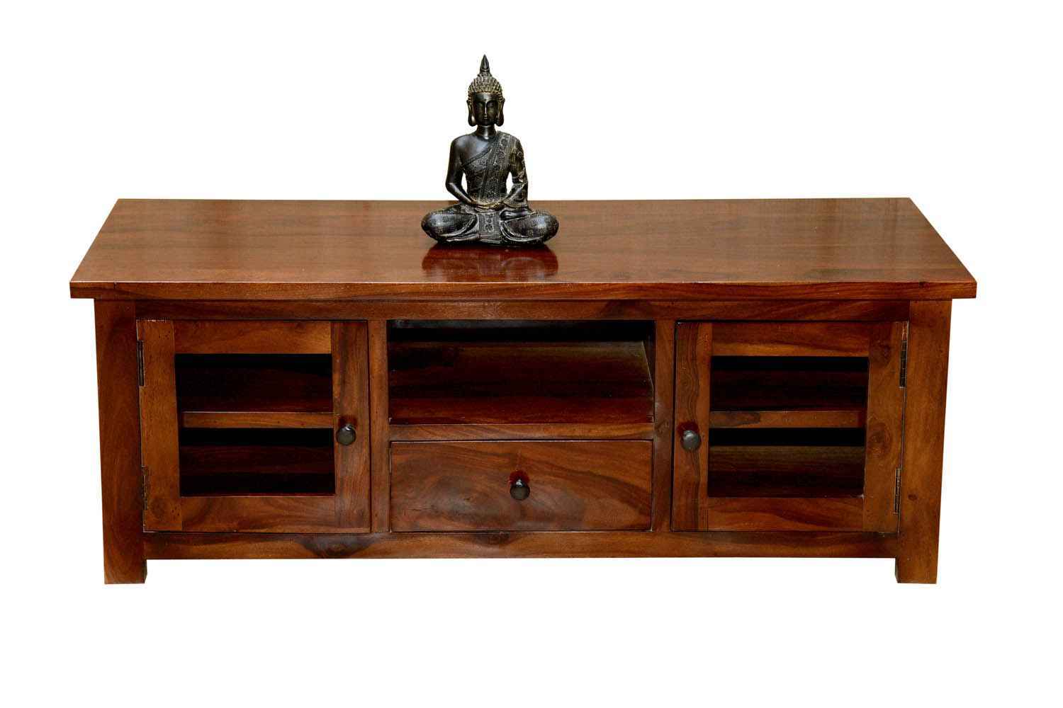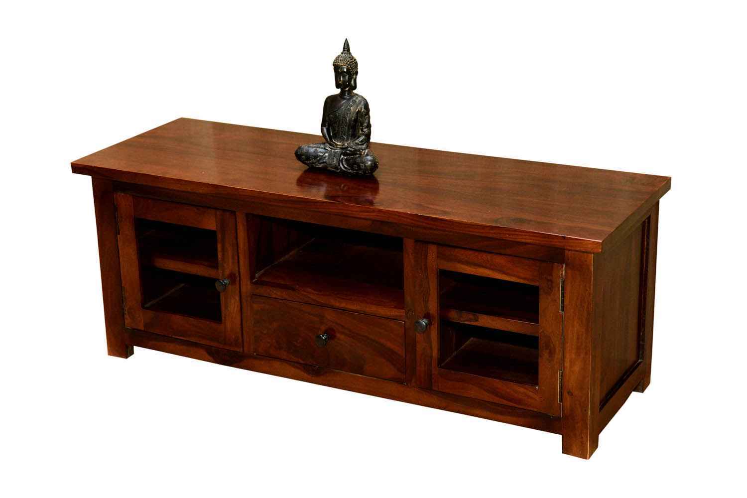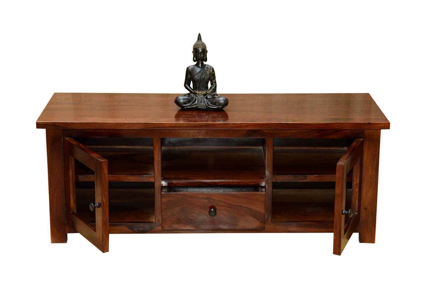 Crater mango wood TV unit made by mango wood with teak finish. This wooden TV unit have two door and one drawer for storage.