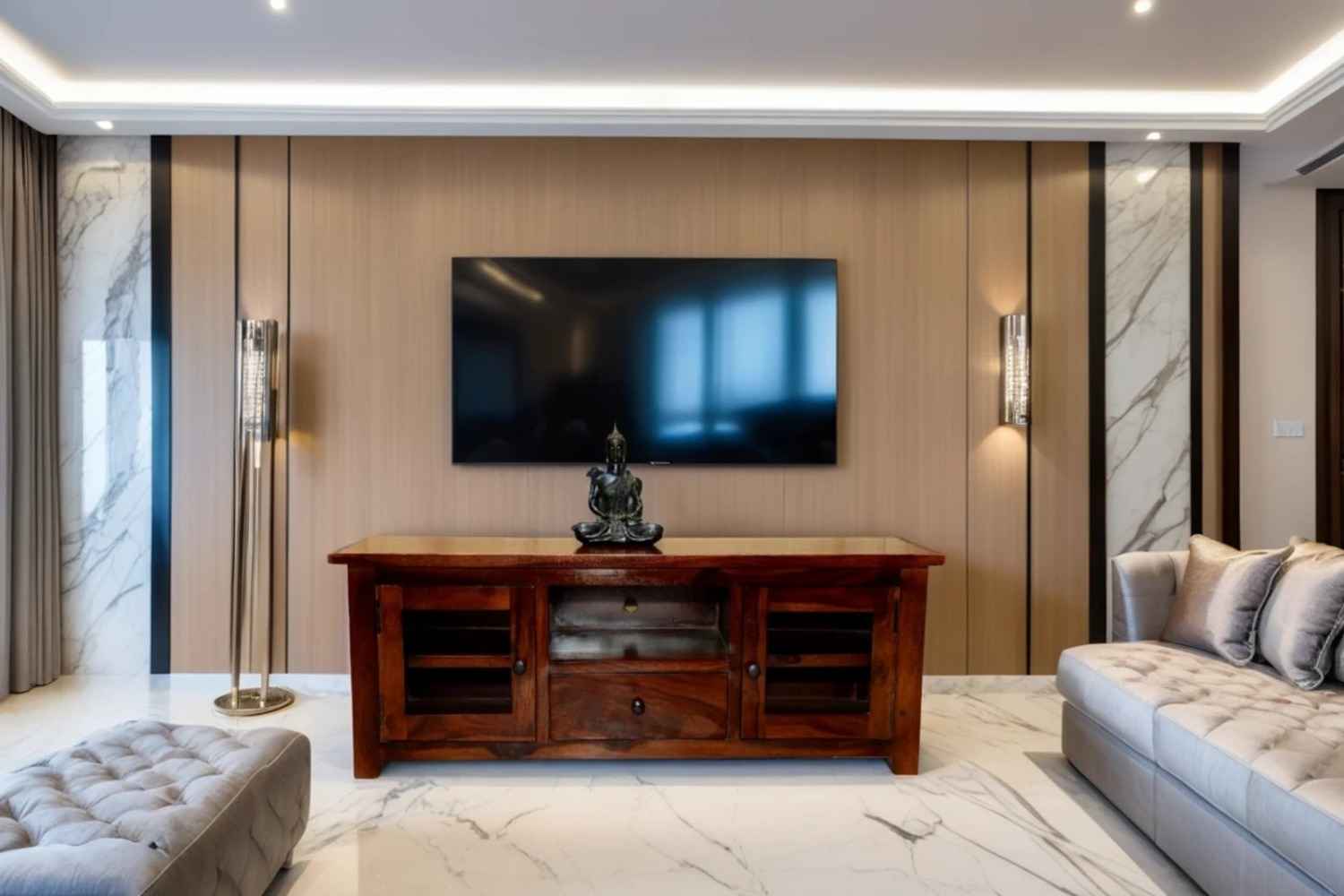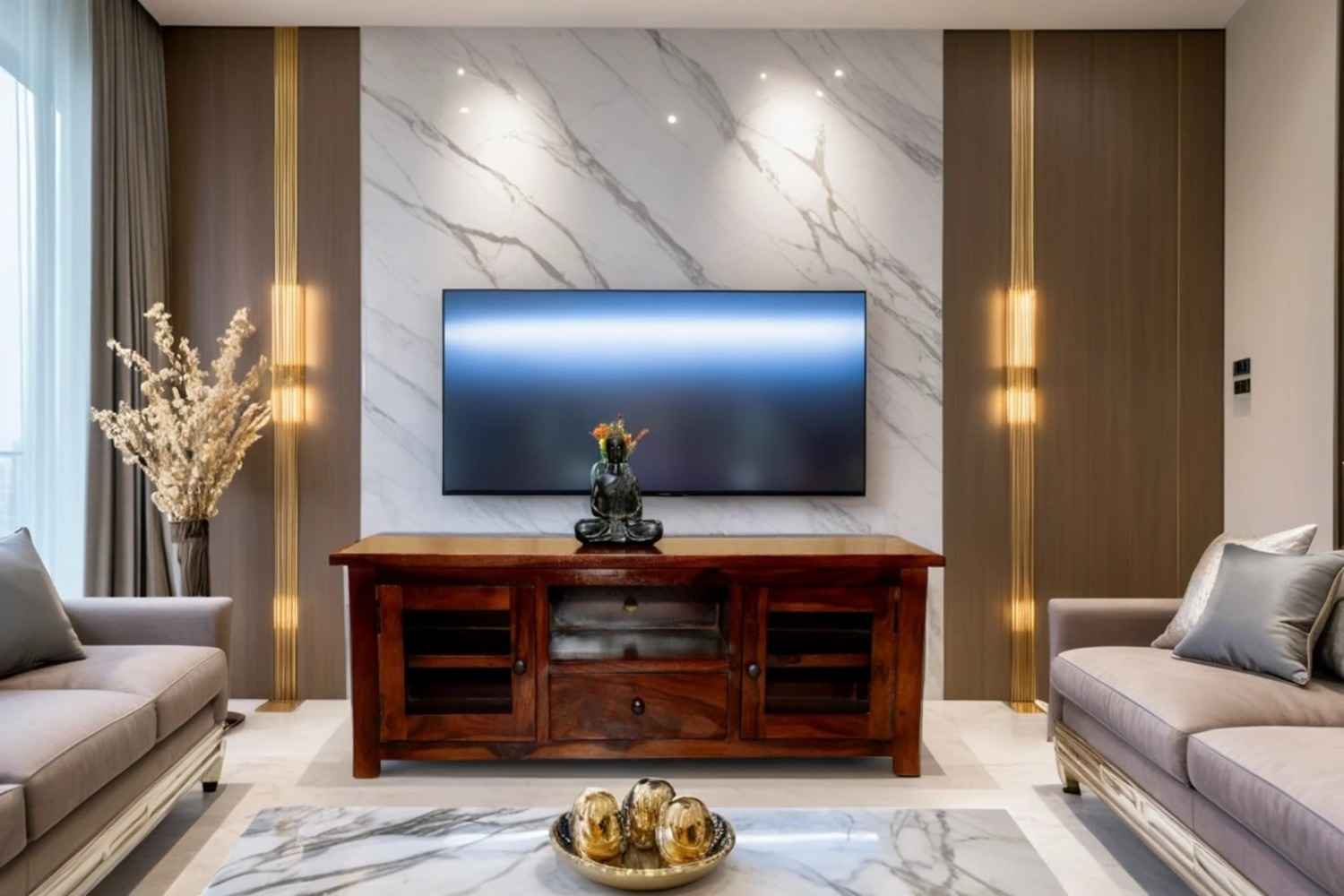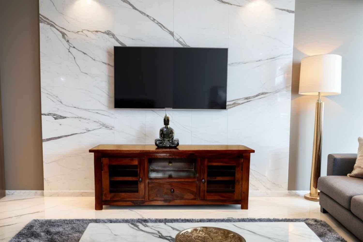 Crater mango wood TV unit made by mango wood with teak finish. This wooden TV unit have two door and one drawer for storage.