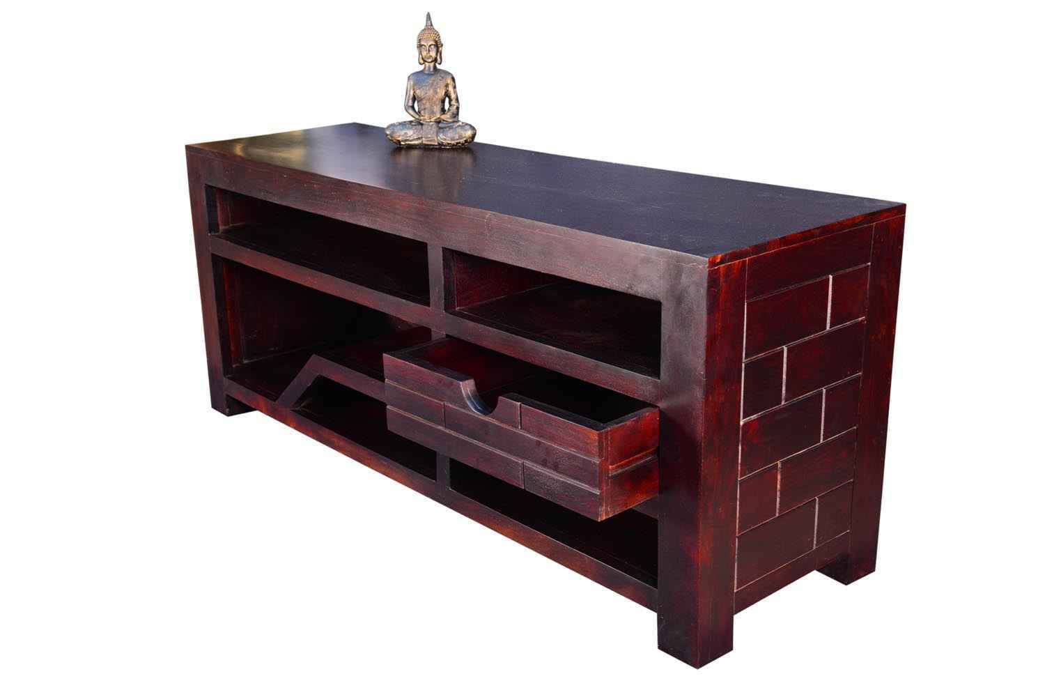 Recto three drawer tv unit is made by Sheesham (Rosewood) with teak finish. It is a television unit that contains three drawers and one blank section. We use Stainless steel  accessories. It is a heavy and stable product. Sheesham wood furniture always count as a best quality product to buy.You can buy Solid wood furniture online from O my furniture.