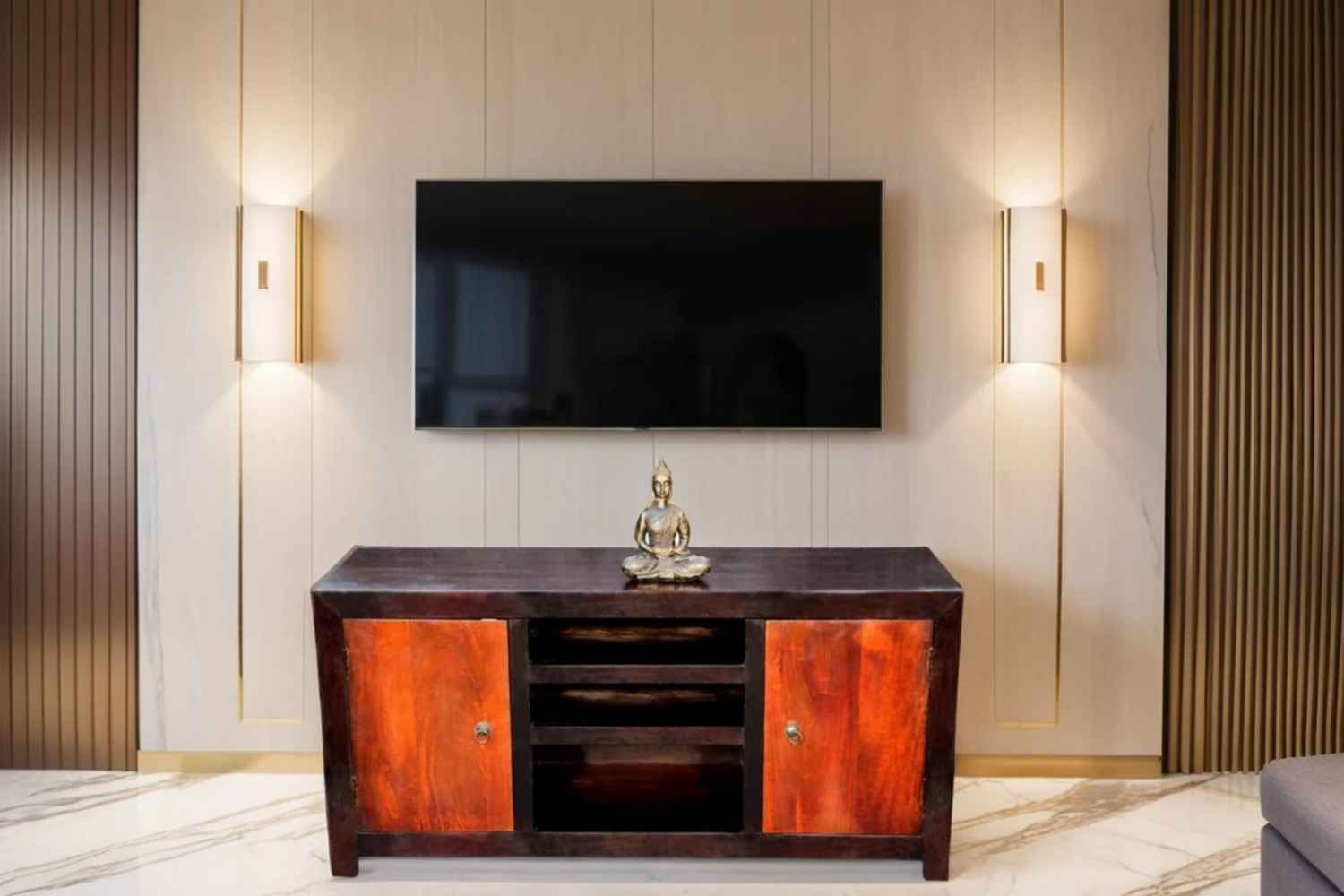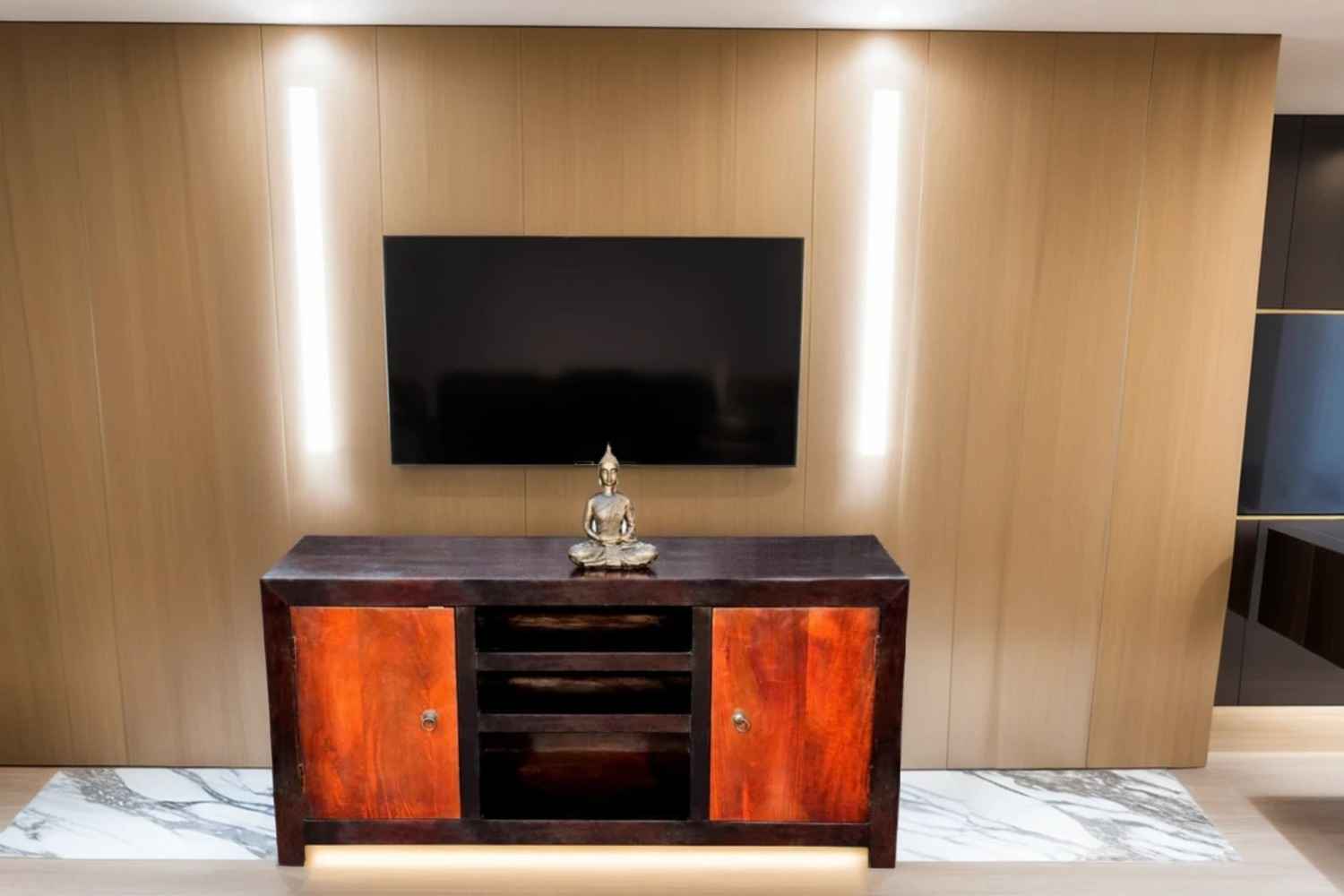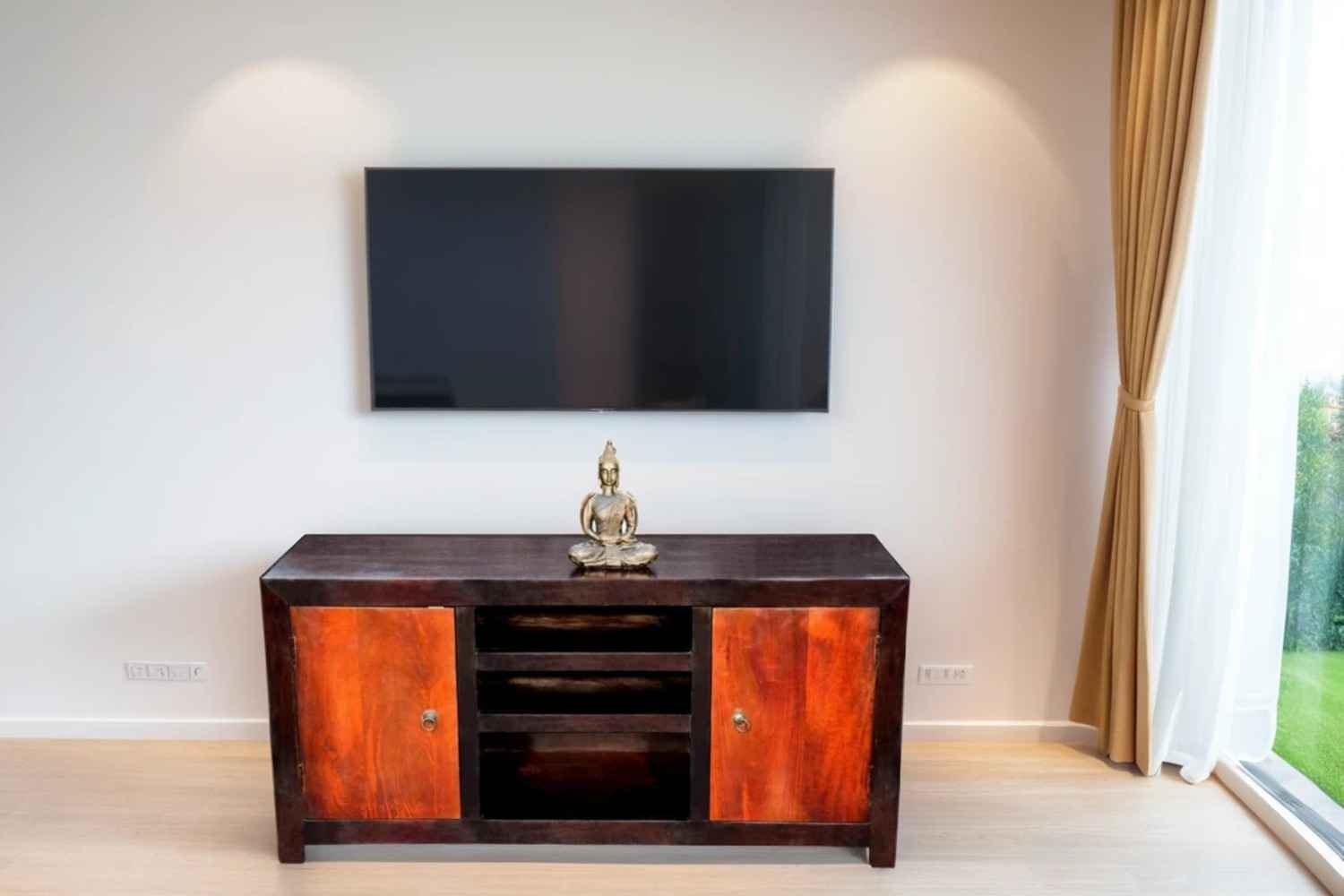 Recto three drawer tv unit is made by Sheesham (Rosewood) with teak finish. It is a television unit that contains three drawers and one blank section. We use Stainless steel accessories. It is a heavy and stable product. Sheesham wood furniture always count as a best quality product to buy.You can buy Solid wood furniture online from O my furniture.
