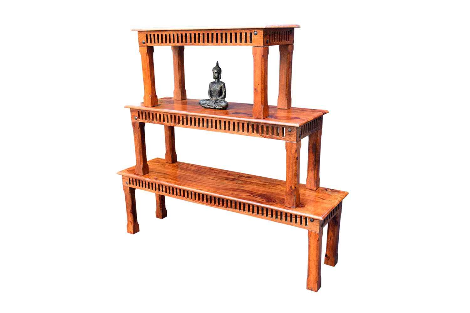 Mesh teak finish small bench is part of set of three benches. It is made by Sheesham wood (Rosewood) with teak finishing. It is framed with jigsaw rectangular cutting design. This set of three benches are equal in shape and design but sizes are different. Legs are well designed. It is light weighted and easy to move. This Sheesham bench is very beautiful & reliable product. You can buy Sheesham wood furniture online from O my furniture.