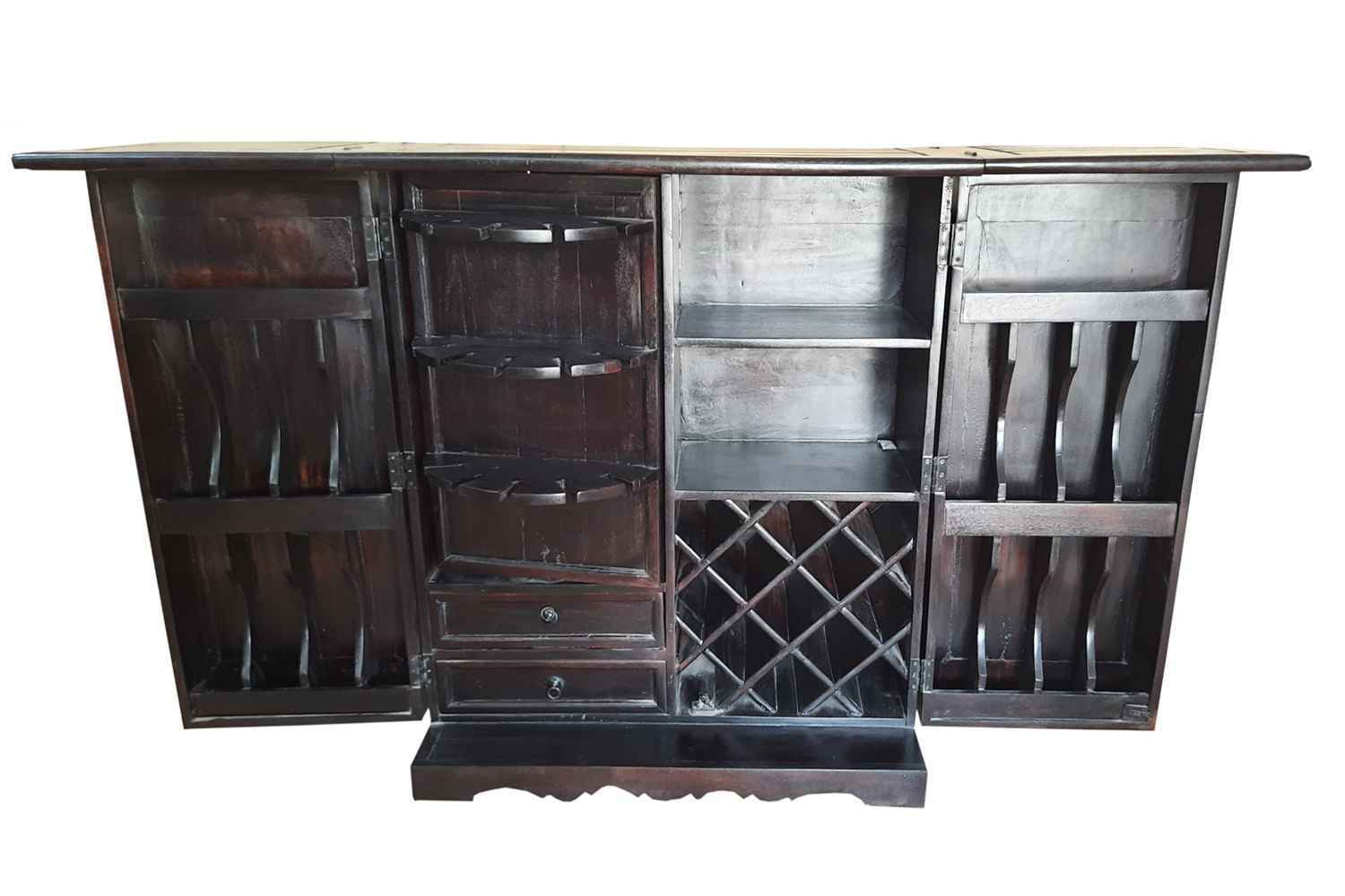 Boldy Bar Cabinet is made by Mango wood with natural finish. This bar cabinet has round legs. We have used powder coated iron as accessories and jigsaw design for the outer portion.It contains bottle holders and many sections. It looks like beautiful antique product. Solid wood furniture always count as a stable furniture or good quality furniture. You can buy Solid wood furniture online from O my furniture.