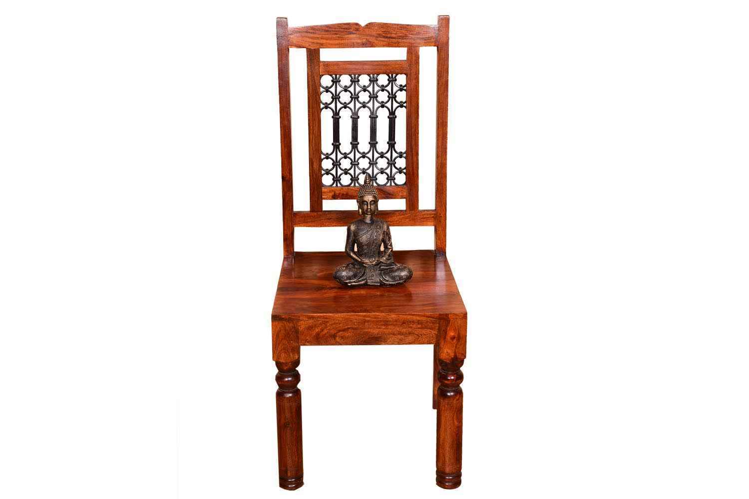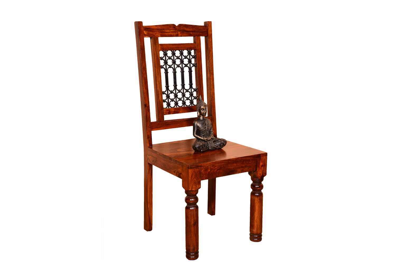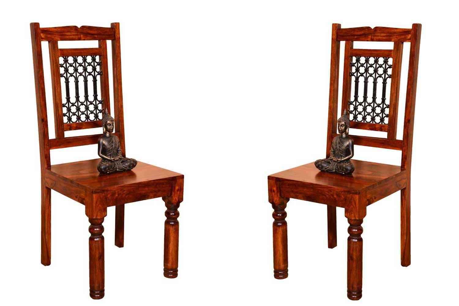Pair of Aloof wood & metal mix chair is made by Sheesham (Rosewood) with teak finish and iron .It wooden chair is a beautiful dining chair for your dining area.Its front two legs in round shape with oval carving and two legs in rectangle shape.Iron jail used in back portion that it be covered in two wooden frames and frame are in well carving. Sheesham wood furniture is best choice to purchase furniture online