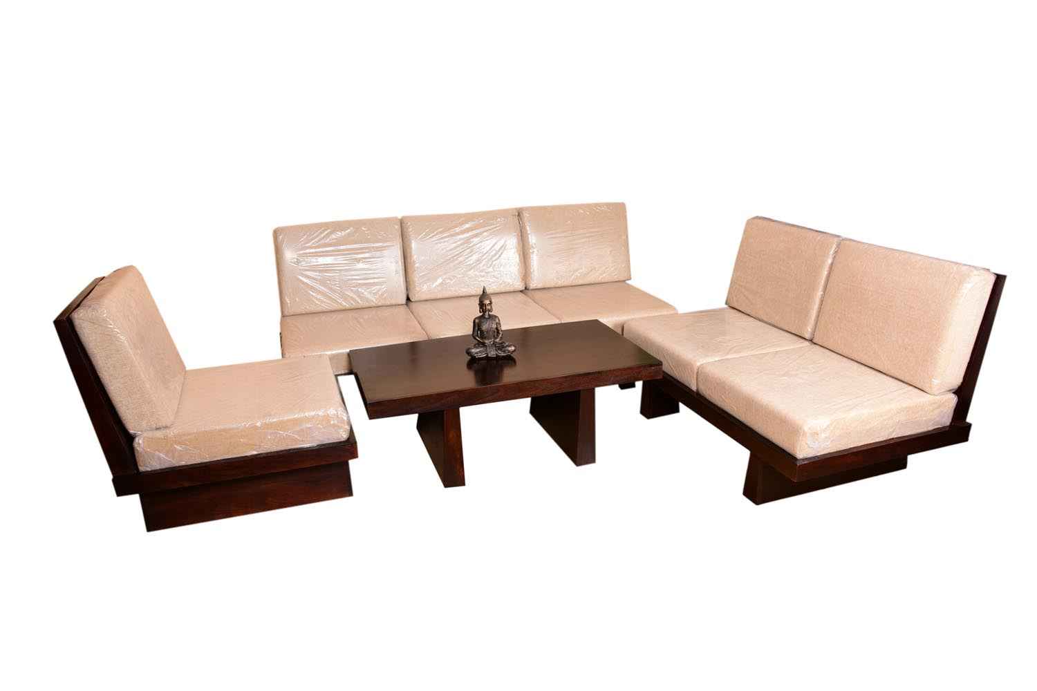 Mayur 2+1+1 sofa set with center table is made by sheesham wood with Walnut finish. we use cream color upholstery on sitting and back section. This is 1+1+2+1(coffee table) sitting sofa with coffee table.coffee table is made by mango wood with walnut finish.