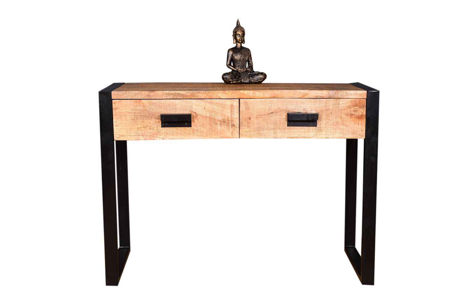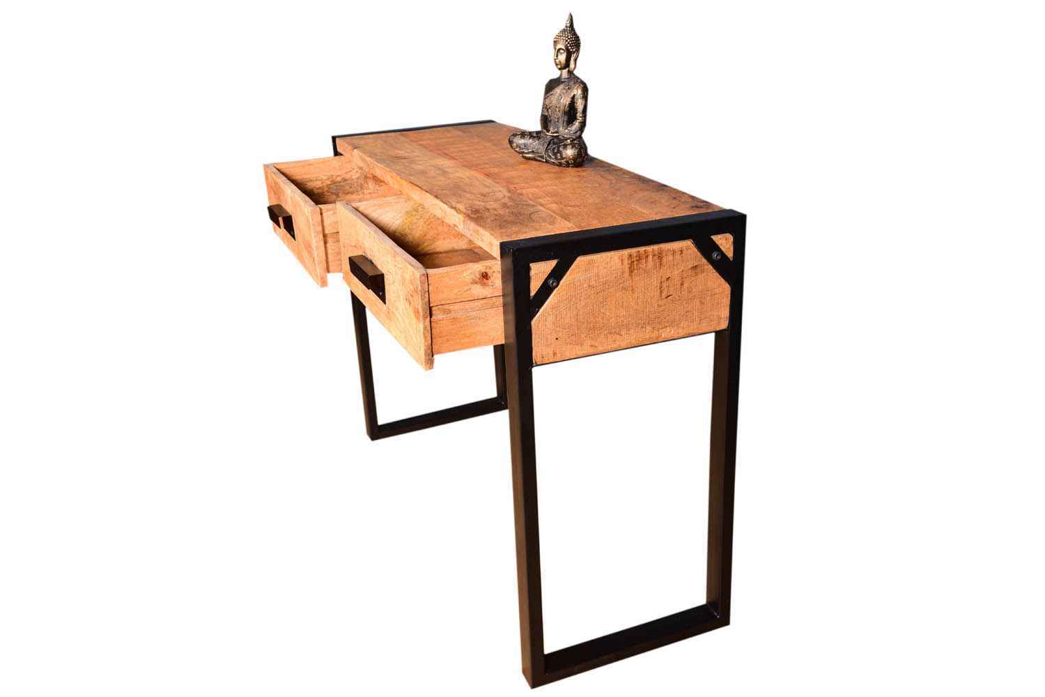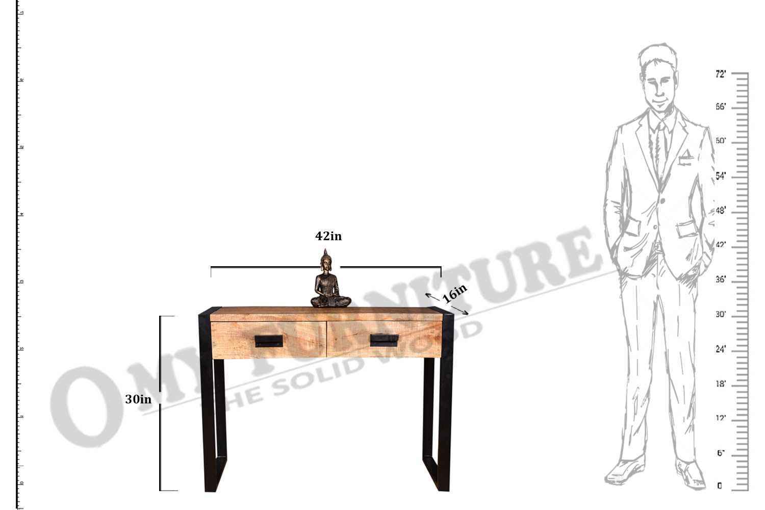 Queer two drawer iron leg console cum study table is made by Mango wood & powder coated iron with Natural finish. Wood is polish by natural finish and iron is powder coated. It is two drawer study table. Accessory is also made by powder coated iron.You can buy Solid wood furniture online from O my furniture.