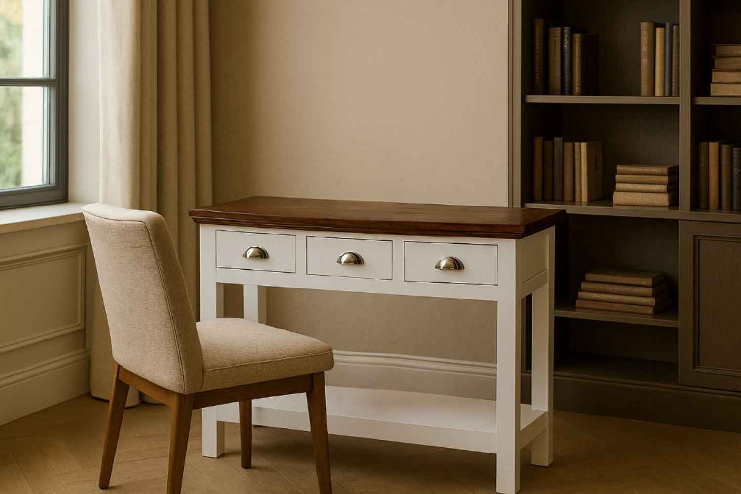 Neoteric console cum study table with bottom self is made by Sheesham (Rosewood) with teak finish. That is one drawer study table. Study table contains bottom shelf for store extra article.As we know Sheesham wood furniture or solid wood furniture have good strength and this type of wooden furniture always count in good quality furniture. You can buy Solid wood furniture online by O My Furniture.