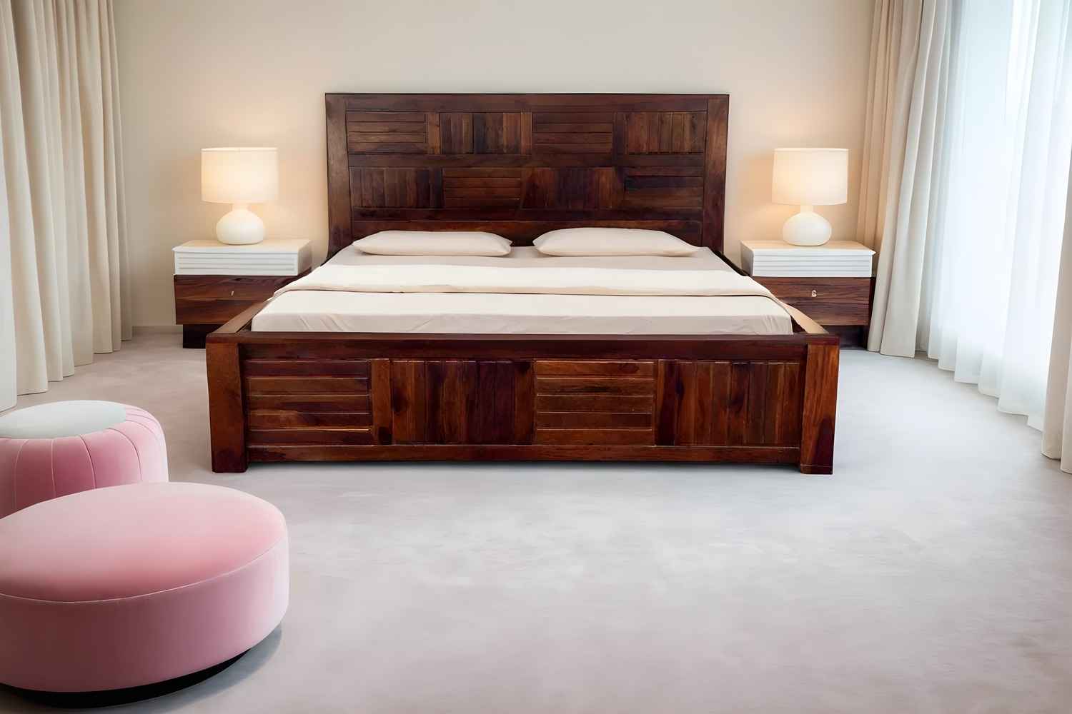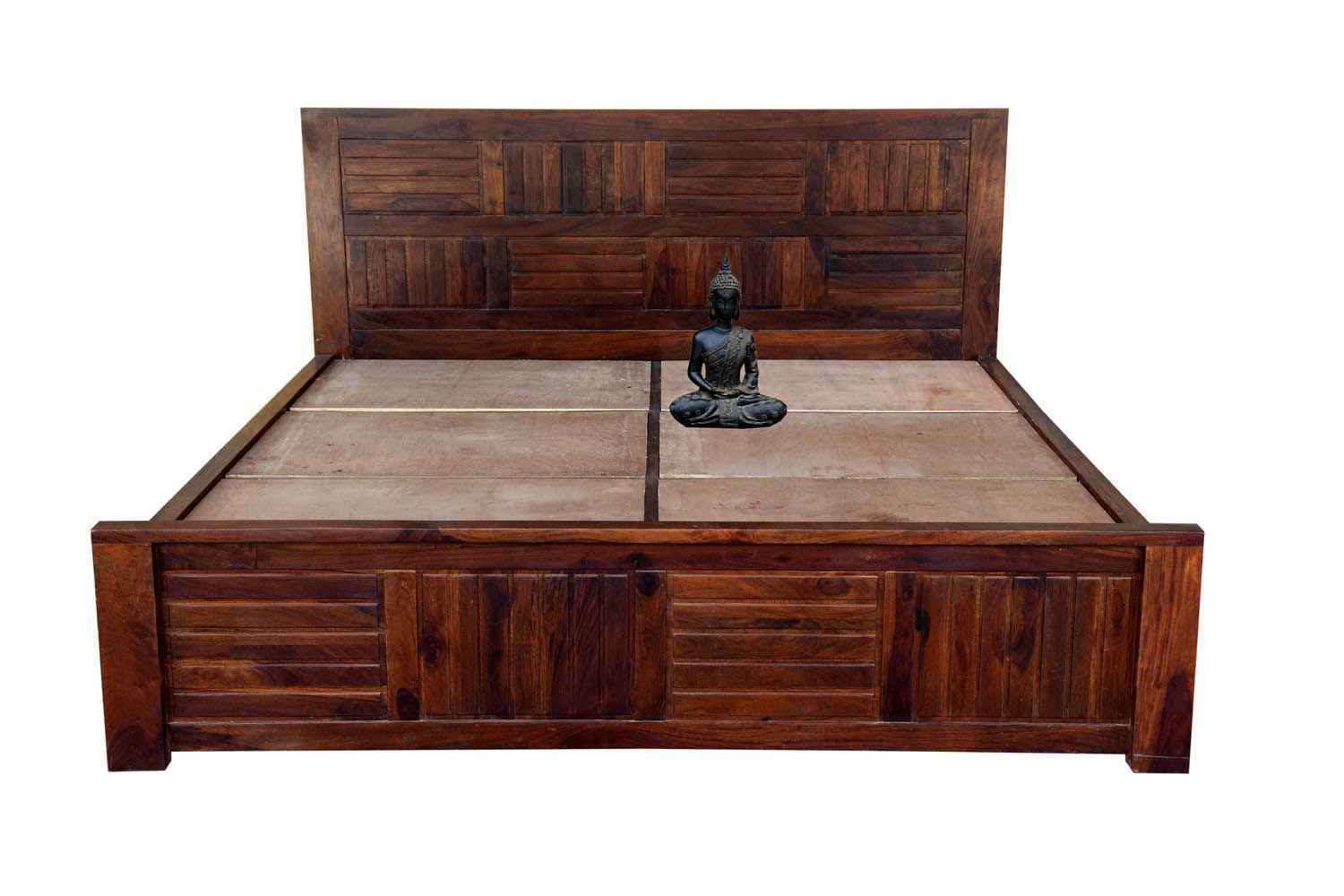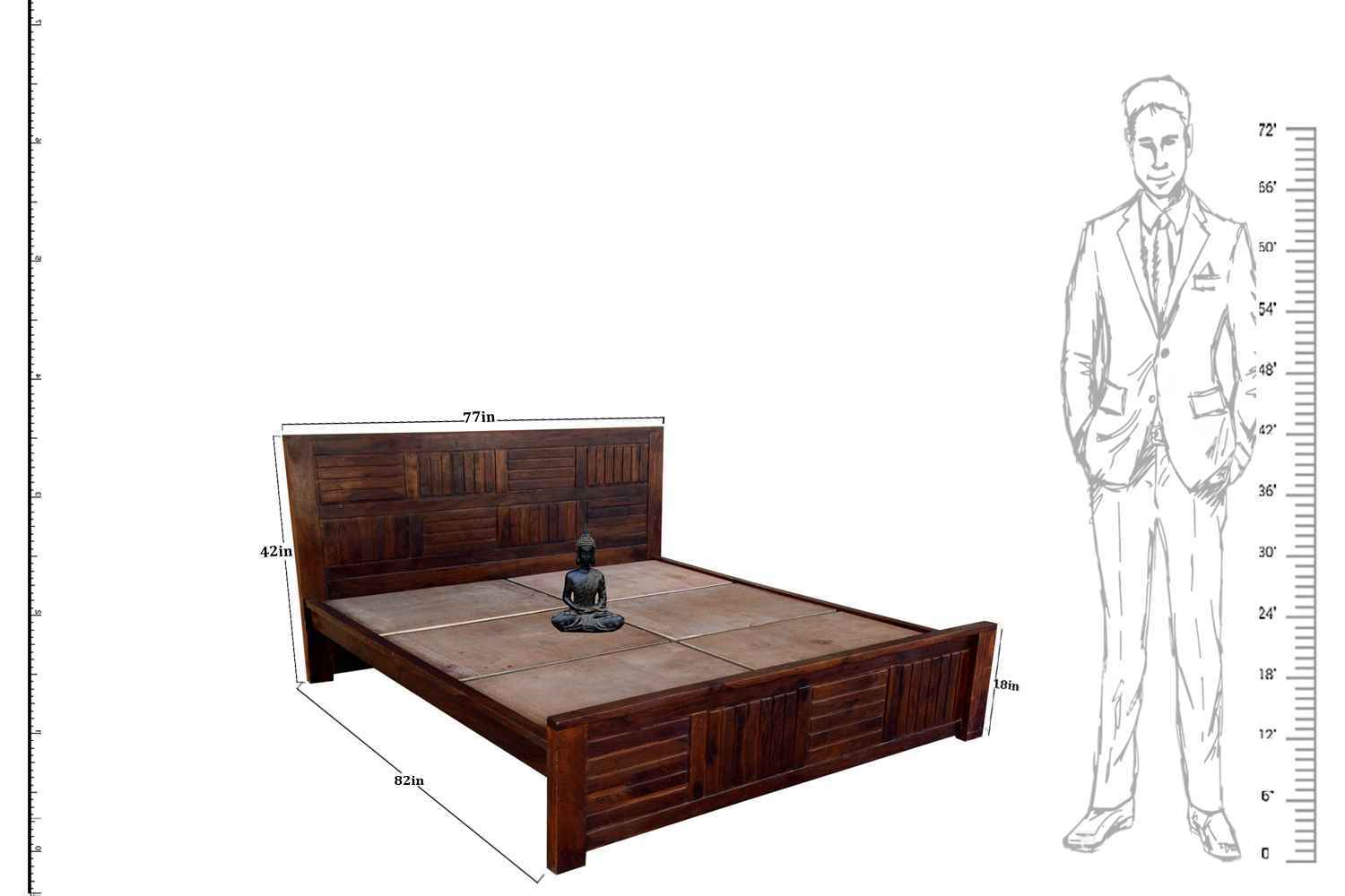 Spline Queen Bed is made up of Sheesham (Rosewood) with teak and iron finishing. It is queen size bed. Head and leg portion of the bed are design with Sheesham wooden strips quilling by iron rods. It is without storage bed and easy to move. It’s quilling strip giving a unique look.You can buy this Sheesham wood furniture online from O my furniture.