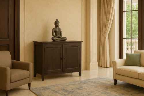 Solid wood two door Teak finish side board is made by Mango wood with teak finish. It contains two doors with stainless steel handle accessories. Doors are designed by star carving design. Its top is marginally out from whole body frame. It is a wide and heavy product with good looking that makes your interior more attractive. You can buy Solid wood furniture online from O my furniture.