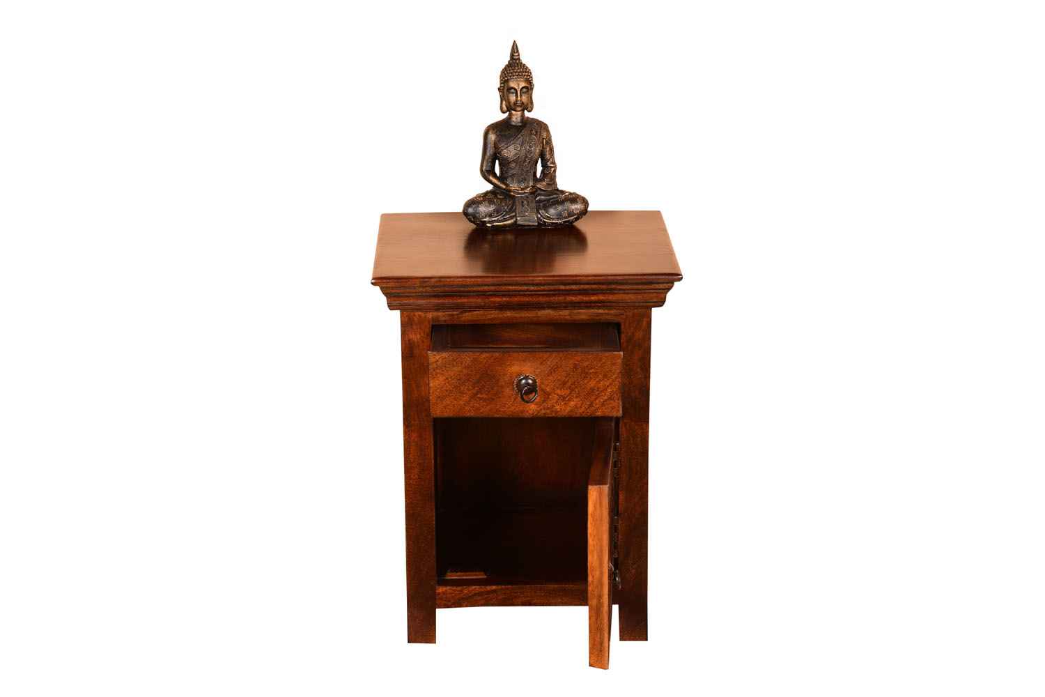 Marlboro Bedside is made by Sheesham (Rosewood) with Mahogany finish.It is one door bedside. Between top and side body frame, there is a gape and top is not completely attached with sides of the frame that gives an amazing look. In inner side there is a shelf which divide it into two parts section. For making of this wooden bedside we used magnet in inner section to give completely grip to the door. Door contain knob to open it easily. Sheesham wood furniture always count in good quality & reliable furniture.You can buy Sheesham wood furniture online from O my furniture.