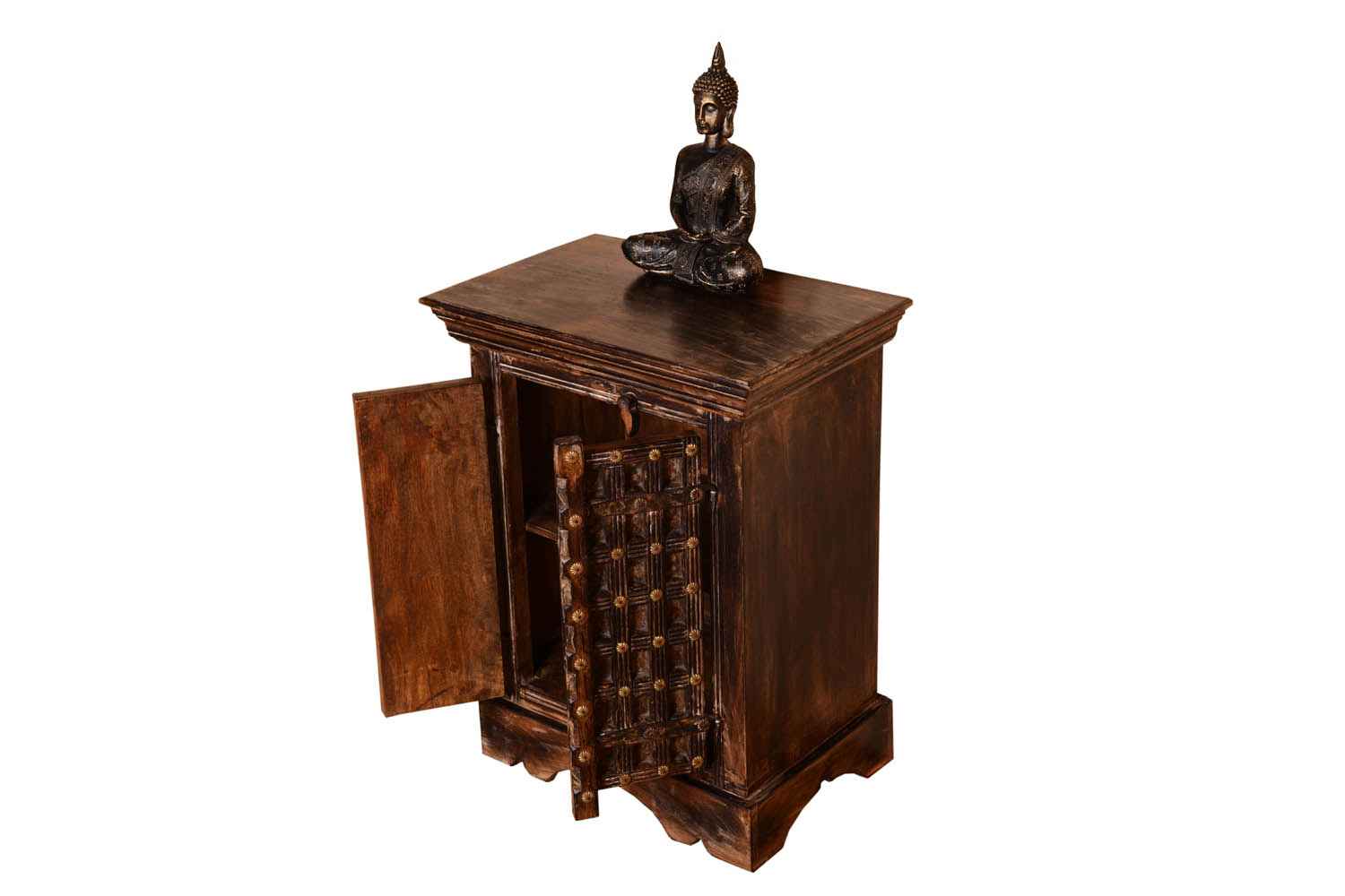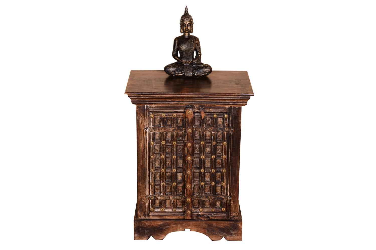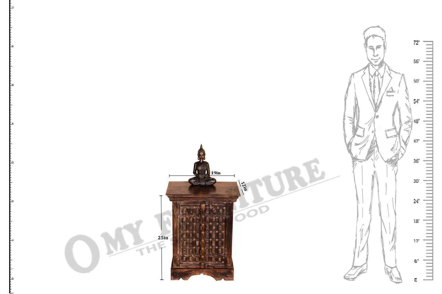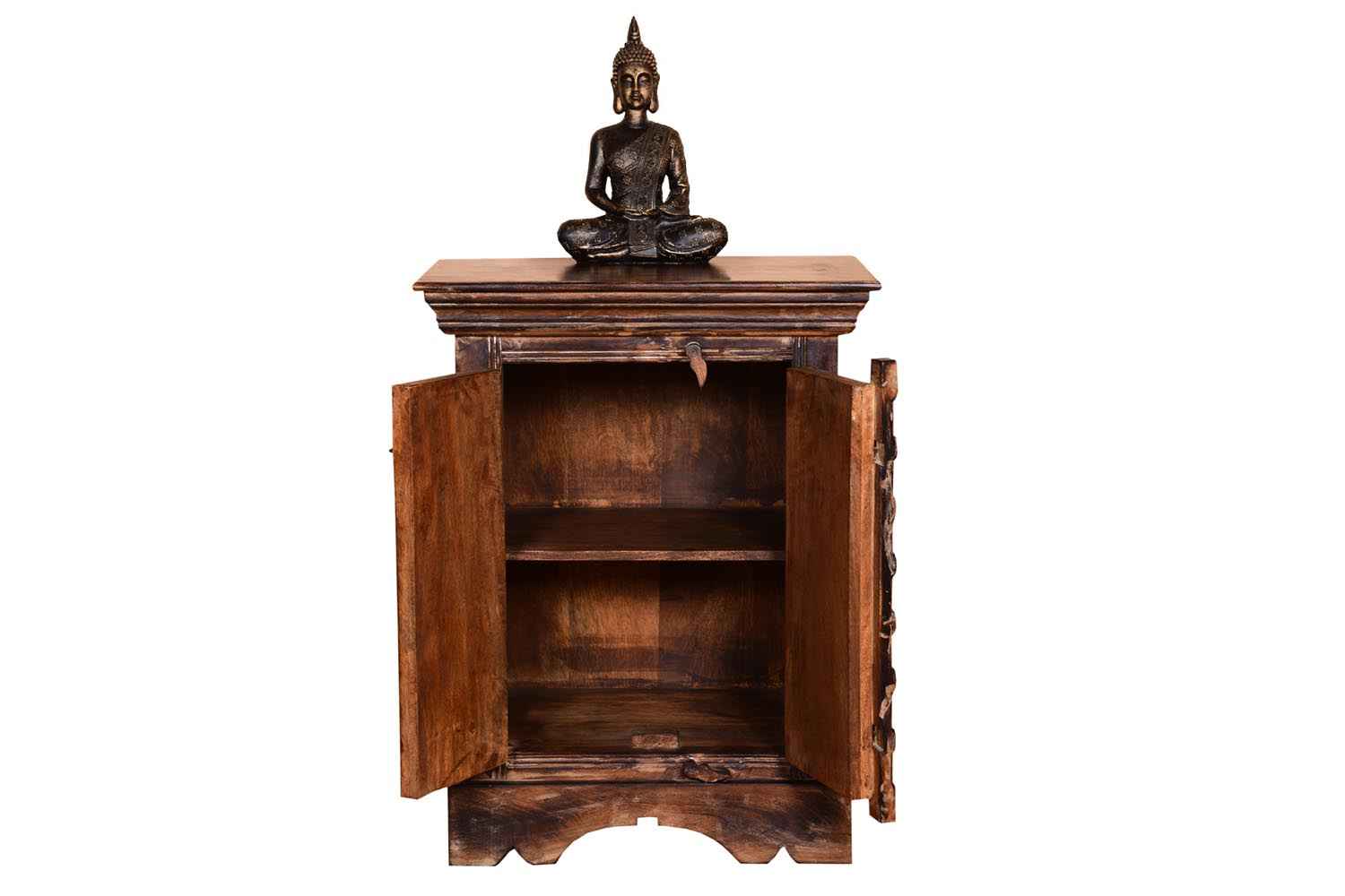 Volvo antique Side Table is made by Mango wood with Antique finish. It is two door bedside and inner side has a middle shelf which divides its section into two parts for holding article. There is a wood lock which is used while closing the door. Wooden bedside door design giving it a heritage look. And its bottom also having a carving design that makes it beautiful. Solid wood furniture always count as a good quality & durable furniture. You can buy Solid wood furniture online from O my furniture.